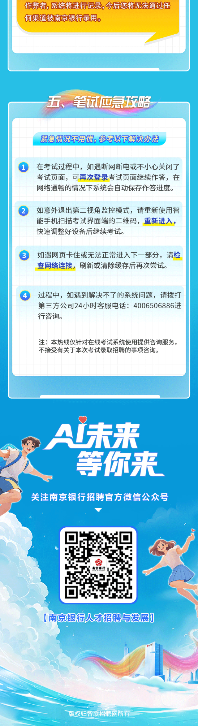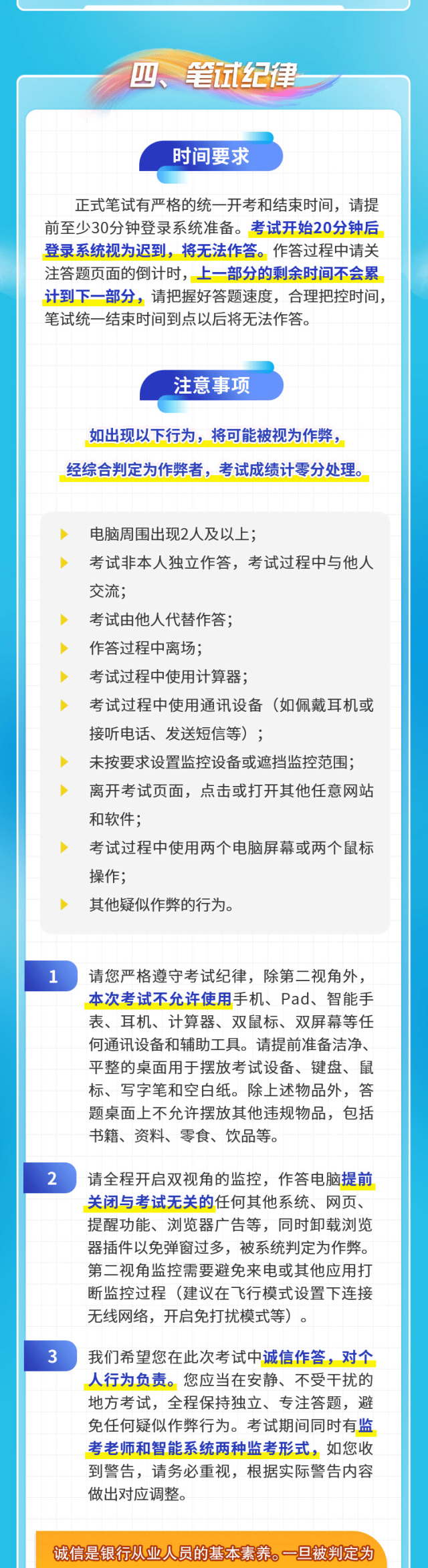 诚信是银行从业人员的基本素养。一旦被判定为作弊者,系统将进行记录,今后您将无法通过任何渠道被南京银行录用。