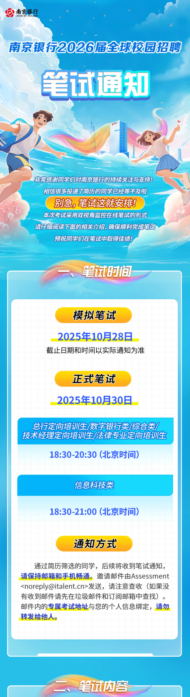 非常感谢同学们对南京银行的持续关注与支持!相信很多投递了简历的同学已经等不及啦别急,笔试这就安排!本次考试采用双视角监控在线笔试的形式请仔细阅读下面的相关介绍,确保顺利完成笔试预祝同学们在笔试中取得佳绩!