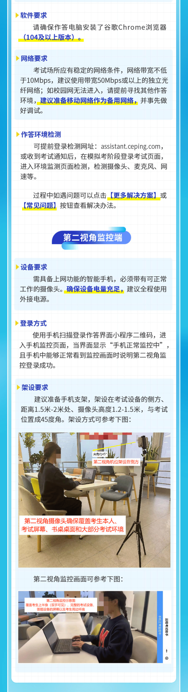 第二视角摄像头确保覆盖考生本人、考试屏幕、书桌桌面和大部分考试环境