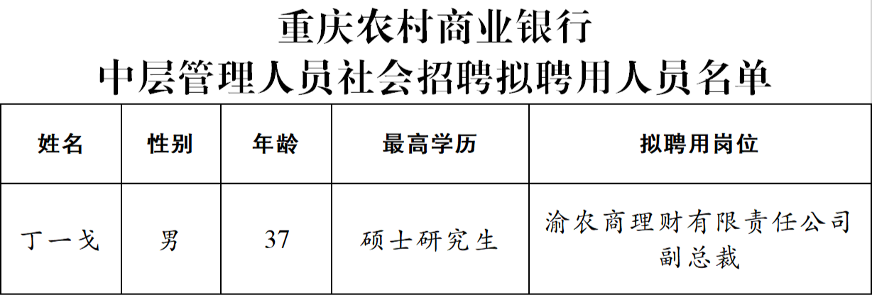 按照重庆市国资委网站2025年11月14日发布《重庆农村商业银行中层管理人员社会招聘公告》的招聘信息,经公开招聘程序,现将拟聘用人员予以公示: