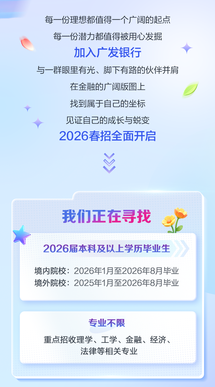 广发银行成立于1988年,2016年成为中国人寿集团成员单位,2021年成为首批国内系统重要性银行,2022年起国家及国有法人持股比例超95%。广发银行已连续15年获评“中国年度最佳雇主”,连续17年入选世界品牌实验室,2024年位列“中国500最具价值品牌榜”银行业第9位,2025年位列《银行家》全球银行1000强第60位。2026年度春季校园招聘现已开启,欢迎投递!